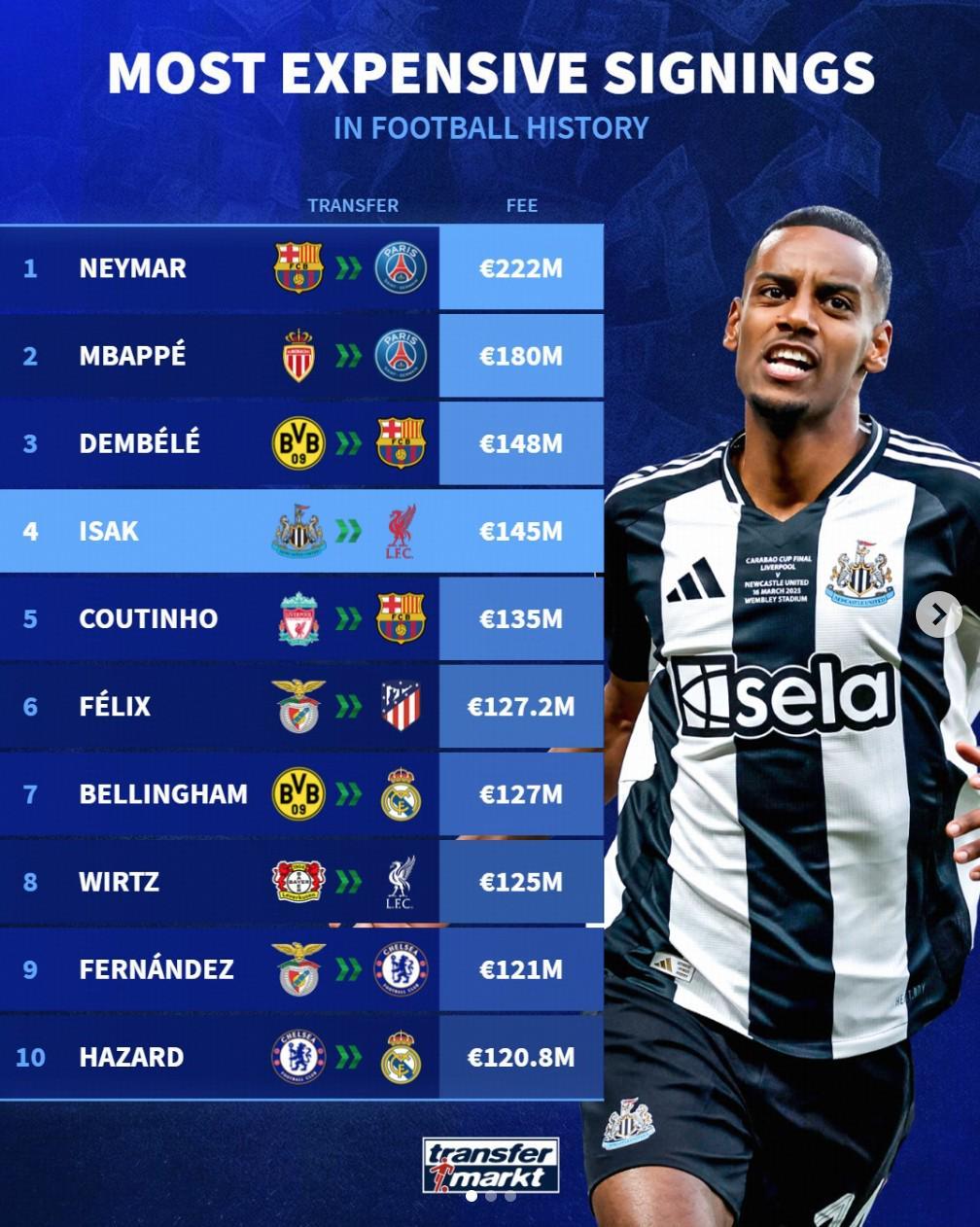 4.伊萨克 1.45亿欧(25/26 纽卡→利物浦)