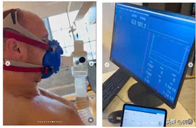 然后镜头转向了关键画面:一块分解测试结果的电脑屏幕,显示着101.1毫升/公斤/分钟的最大摄氧量。布卢门费尔特在帖子的配文中没有对这个分数发表评论。